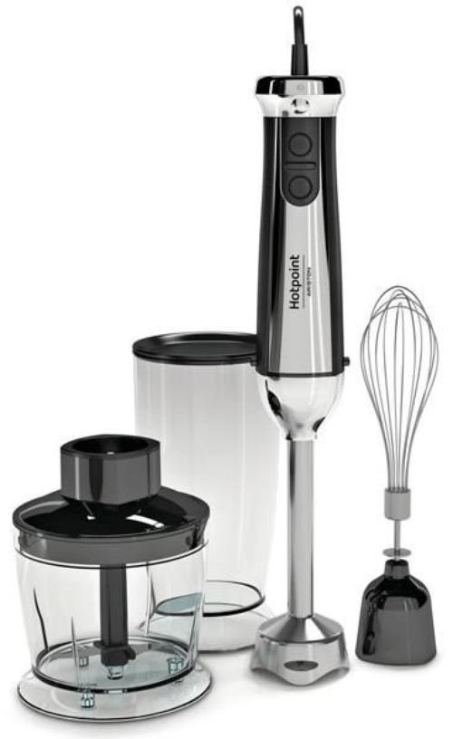 Блендер Hotpoint Ariston HB 0803 UP0 Погружной блендер Hotpoint-Ariston HB 0803 UP0 из серии Ultimate – компактный и в то же время мощный бытовой прибор. Он прост в использовании, надёжен и безопасен, его можно использовать для измельчения, смешивания, взбивания продуктов. РЕГУЛИРОВКА СКОРОСТИ Скорость работы прибора можно регулировать. Разработчики предусмотрели шесть скоростных режимов, а также турборежим, позволяющий на короткое время существенно увеличить скорость вращения насадки. ПРОДУМАННАЯ КОНСТРУКЦИЯ Погружная часть блендера и его ножи выполнены из нержавеющей стали. Прибор оснащён прорезиненной ручкой, которая удобно лежит в ладони и не выскальзывает. 3 НАСАДКИ В КОМПЛЕКТЕ В комплект входят базовые насадки: металлический венчик для взбивания, насадка для измельчения и смешивания, а также мини-измельчитель. Количество скоростей: 6 Турборежим: да Количество насадок: 3 Насадки в комплекте: блендер, венчик, измельчитель Материал корпуса: пластик Материал погружной части: нерж. сталь Макс. потребляемая мощность, Вт: 800 Комплектация: мерный стакан, измельчитель, блендер, венчик Доп. особенности: прорезиненная ручка