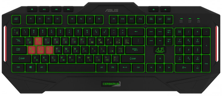 Клавиатура ASUS Cerberus MKII проводная клавиатура интерфейс USB для настольного компьютера классическая конструкция, мембранная клавиш: 110, дополнительных: 6 размеры (ШxВxГ): 471x41x186 мм вес: 1100 гКлавиатура ASUS Cerberus MKII