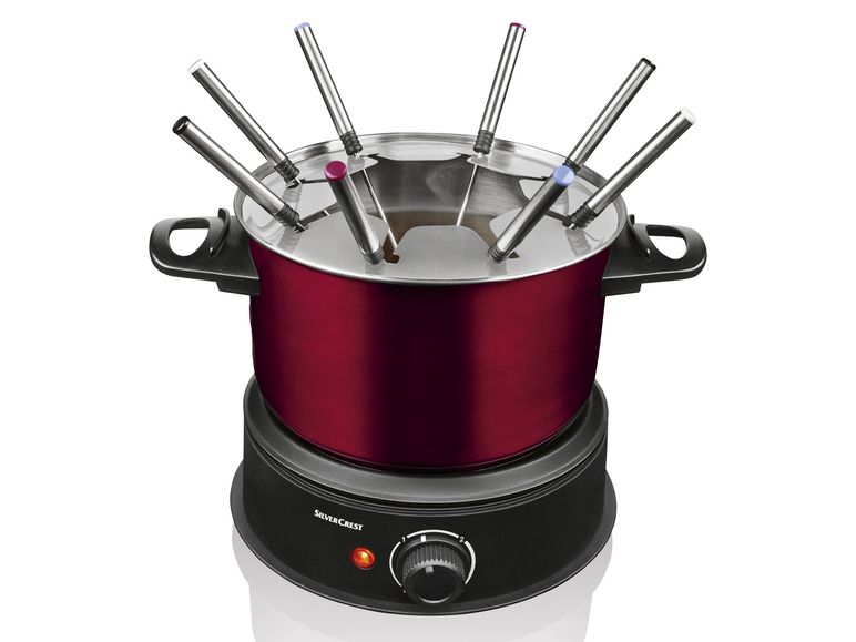 Fondue Set SilverCrest SFE 1500 C2 (Red) Электрический фондю SilverCrest SFE 1500 C2 рассчитан на компанию из восьми человек. Данная модель оснащена регулируемым термостатом и алюминиевой нагревательной пластиной с антипригарным покрытием. Устойчивость прибора обеспечивают нескользящие ножки. Общие характеристики Тип: фондю электрический Объем: 3 л Мощность: 1500 Вт Количество предметов: 8 Цвет: нержавеющая сталь Размеры: 22.5х29х19.8 см