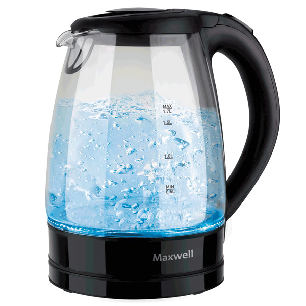 Электрочайник MAXWELL MW-1083 TR объем 1.7 л мощность 2200 Вт индикация включения закрытая спираль установка на подставку в любом положении корпус из пластика и стекла подсветка корпуса