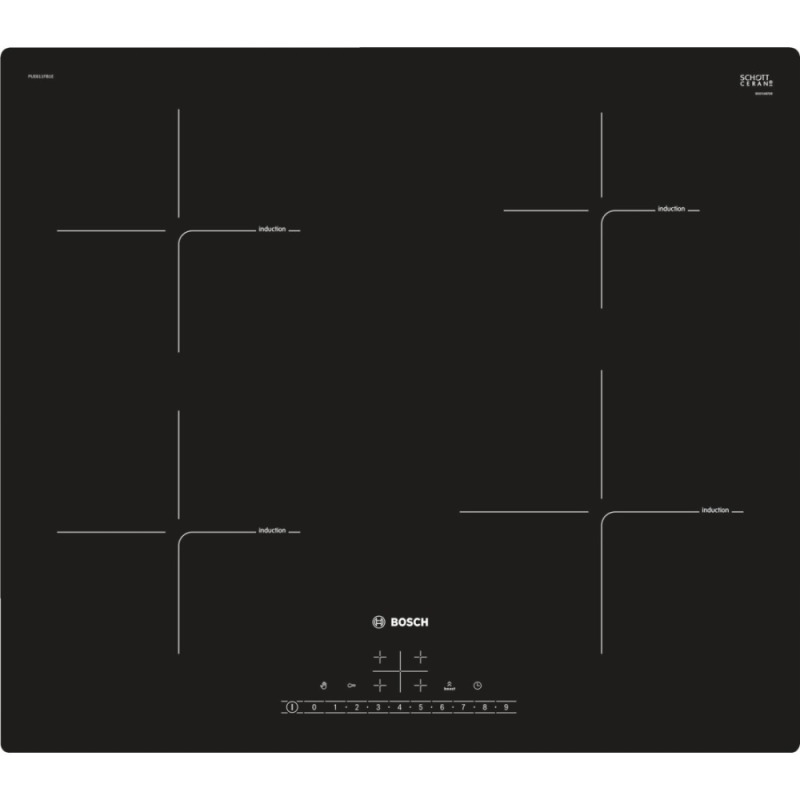 Варочная индукционная панель Bosch PUE611FB1E электрическая варочная панель стеклокерамическая поверхность индукционные конфорки переключатели сенсорные кнопочное защита от детей индикатор остаточного тепла независимая установка габариты (ШхГ) 59.2x52.2 см