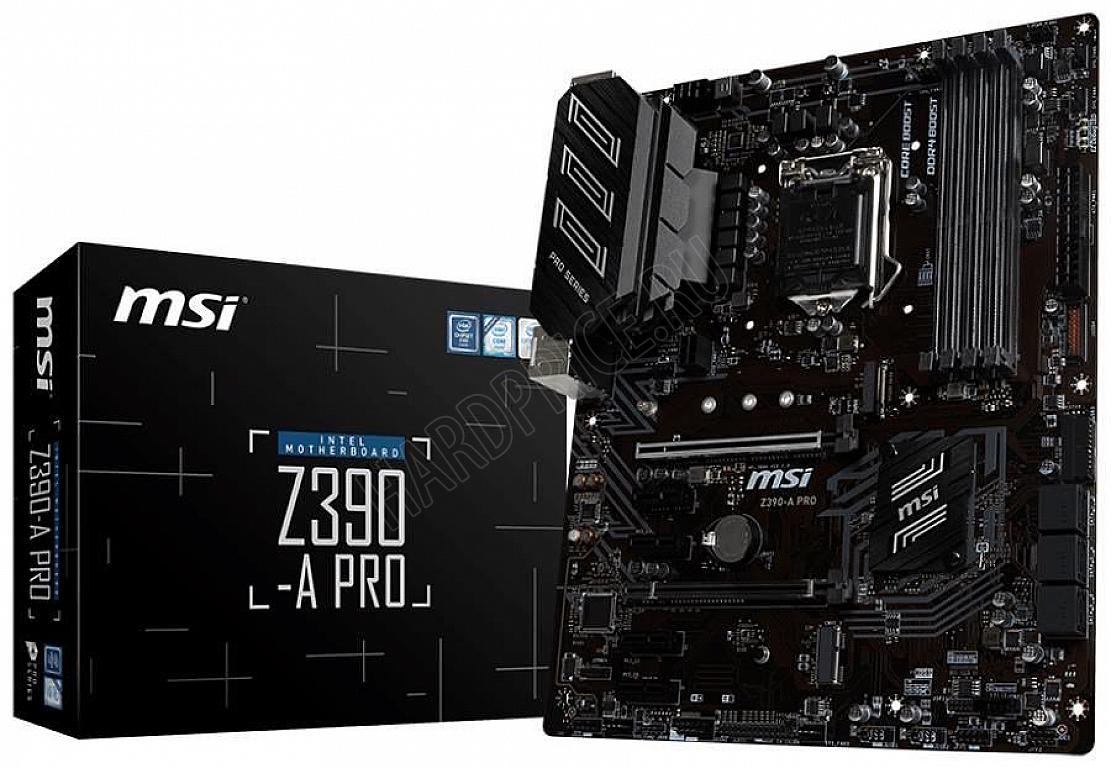 Материнская плата MSI Z390-A PRO, Socket 1151, Intel® Z390, ATX (9th/8th Gen CPU), Dual 4xDDR4-4400, 2xPCIe X16, CPU Intel graphics, VGA, DVI, DP, 6xSATA3, RAID, 1xM.2 slot, 4xPCIe X1, ALC892 HDA, GbE LAN, 2xUSB3.1 Gen 2 (Type-C & Type-A), 8xUSB3.1 материнская плата форм-фактора ATX сокет LGA1151 v2 чипсет Intel Z390 4 слота DDR4 DIMM, 2133-4400 МГц. поддержка CrossFire X разъемы SATA: 6 Гбит/с - 6
