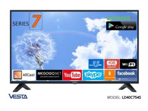 Телевизор Vesta LD40С754S Диагональ экрана 40 Разрешение экрана 1366x768 (HD) Поддержка Smart TV Есть Операционная систем Android OS Частота, Гц 200 Тип матрицы TN USB 2 Динамики, Вт 20 Особенности WI-FI, Ethernet