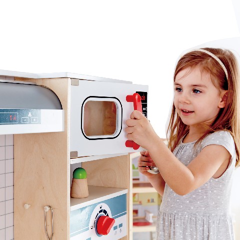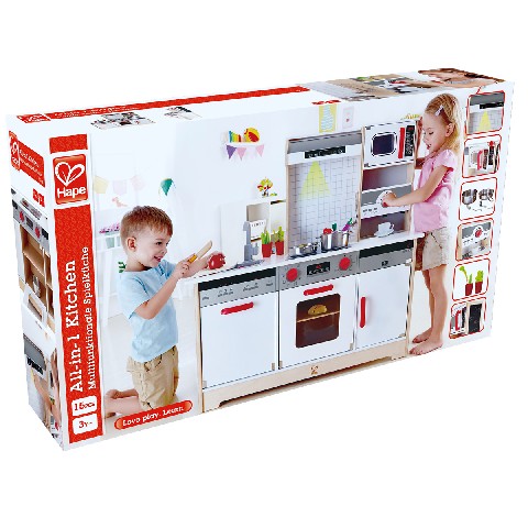 HAPE-ALL-IN-1 KITCHEN Hape Детская Kухня "All-in-1" Детская кухня - это отличный подарок для ребенка, который любит играть в сюжетные игры с друзьями и распределять обязанности. Детская игровая кухня имеет достаточно большие размеры и функциональное оборудование, поэтому играть здесь могут несколько деток одновременно. В комплект входят восхитительные аксессуары, такие как кофеварка, раковина, духовка, шкафы для хранения вещей, микроволновая печь, посудомоечная машина, детектор дыма и даже вытяжкa. Эта игрушка идеально подходит для того, чтобы вдохновить ваших малышей сделать свои собственные кулинарные шедевры! Соответствует международным стандартам качества. Размер: 97 x 97 x 37 cм Материалы: дерево, пластик Рекомендуемый возраст: 3 года +