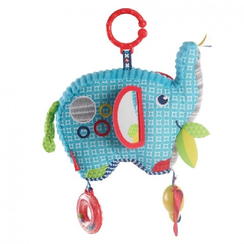 FP Zornaitoare "Elefant" Fisher-Price Мягкая игрушка-подвеска "Слоник" У этого забавного слоненка множество ярких деталей с различными текстурами. Они будут развлекать малыша и помогать ему развивать мелкую моторику и органы чувств. Малыш будет в восторге от ярких погремушек, а зеркальце познакомит малыша с собственной милой улыбкой. К тому же эту игрушку так приятно обнимать! Благодаря кольцу игрушку удобно прикреплять к коляске или сумки, а также брать с собой на прогулку. Рекомендуемый возраст: от 0 месяцев