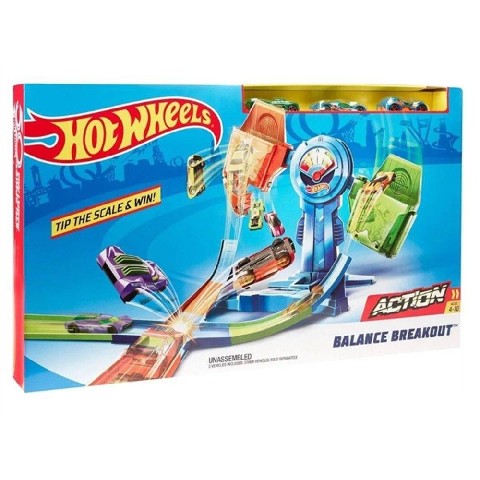 Pista HW Balance Breakout Mattel Игровой набор "Невероятное превосходство" Hot Wheels бросает вызов детям! Устраивай соревнования друзей вмести с этим крутым треком. В наборе ты найдешь сразу 2 пусковые установки, 2 контейнера и аварийную зону. Загружай машинки в свою пусковую установку и запускай их по одной, направляя в специальный контейнер в конце трека. Сбивай или блокируй соперника в аварийной зоне, ведь твоя главная задача - опередить его машинки и попасть своими авто в контейнер как можно больше раз. Как только преимущество будет на стороне одного из игроков, дно контейнера проигравшего откроется и его машинки выпадут. Это победа! В комплект входят: 3 машинки Рекомендуемый возраст: 4 - 10 лет