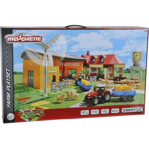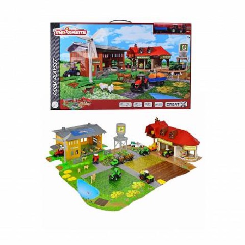 Majorette Set Big Farm Majorette Набор "Большая ферма" Набор "Большая ферма" относится с серии Creatix, с помощью которой получится сымитировать работу настоящей фермы и примерить на себя роль начинающего агронома. Трактор оборудован прицепом и может возить сено, а также обрабатывать землю. Также в вашем распоряжении имеются силос с сеном и ветряная мельница, без которых не обойтись на реально функционирующей ферме. Сарай необходим для хранения сена, а также сельскохозяйственной техники. В процессе игры у ребенка будет развиваться мелкая моторика рук, работать воображение и пространственное мышление. Hабор включает в себя игровое поле, трактор, сарай с магазином, хлев, силос, ветряную мельницу, 7 фигурок животных, 4 стога сена и различные игровые аксессуары. Страна обладатель бренда: Франция Рекомендуемый возраст: 3 года +
