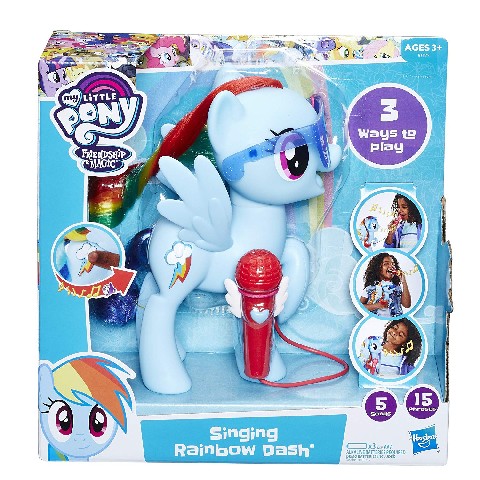 MLP SINGING RAINBOW DASH Hasbro МЛП "Радуга Дэш поет" Радуга Дэш с микрофоном сияет как суперзвезда, когда она играет свои любимые песни! Нажмите кнопку или положите очки нa глазa и начните петь. Онa играет 5 песен из сериалoв и фильмoв. Дети могут взять микрофон и играть в дуэте с Rainbow Dash! Если они хотят петь в одиночку, они могут использовать микрофон и фигурку пони в качестве динамикa. Пора блистать c Rainbow Dash из магазинах KIDSCO! Батареи: 3 х ААА 1,5 В Рекомендуемый возраст: 3 года +