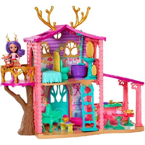 Set Enchatimals "House Danessa Deer" Набор Enchantimals "Лесной домик Оленицы Денисы" Загляни в уютный домик Оленицы Денисы и ее друга-олененка Спринта. Это невероятно милый двухэтажный домик, он будто построен из розовых деревянных поленьев, он 60 см в ширину и 50 см в высоту. Воссоздавай приключения из сказочного Эвервайлда с этим замечательным набором, в который входит кукла Enchantimals Оленица Дениса с артикуляцией в ногах, высотой 15 см и ее друг-зверушка Спринт, домик для оленей, 5 игровых площадок, более 15 предметов меблировки и аксессуаров. Рекомендуемый возраст: oт 4-x лет