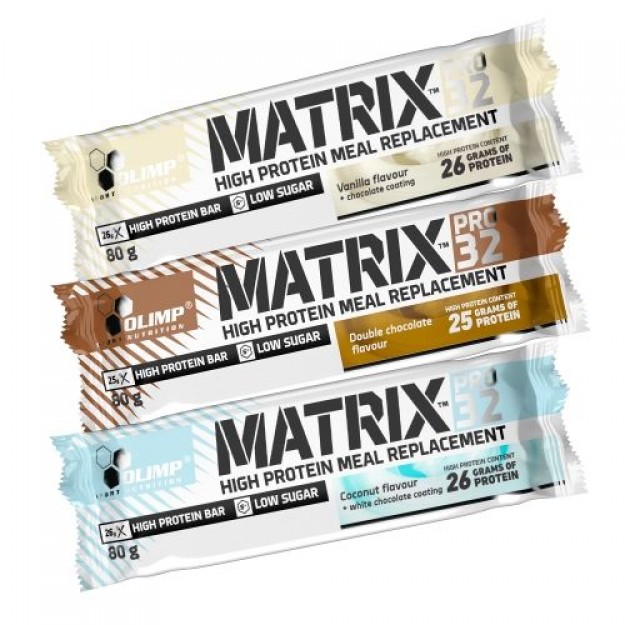OLIMP MATRIX PRO 80 GR Matrix Pro - протеиновый батончик для поддержания и набора мышечной массы. В каждом батончике Matrix Pro 32 содержится 25 гр протеина, аминокислоты, bcaa, витамины и минералы что в общей сложности дает мощный энергетический эффект, оказывает антикатаболическое воздействие, питает мышечные ткани для их быстрого восстановления после нагрузок и дальнейшего роста общей мышечной массы. Белковые батончики Matrix Pro 32 содержат минимум сахара, углеводом и других не нужных веществ. Протеиновые батончики для спортсменов Matrix Pro Olimp обогащают организм полезной энергией которая необходима для нормального спортивного прогресса. Спортивные батончики Matrix Olimp содержат много полезных для мышечной массы ингредиентов, отличаются хорошими вкусовыми качествами, оптимальным объемом (80 гр) для полноценного подавления чувства голода после его приема и имеют оправданную и доступную цену что генерирует высокий спрос и положительные отзывы спортсменов. Состав батончика Matrix Pro Olimp шоколад: Калорийность - 253 ккал Протеины - 25,1 г Углеводы - 19,7 г Жиры - 8,1 г Клетчатка - 12,6 г Натрий - 0,18 г Витамины и минеральные вещества на 100 г: Витамин А - 211 ?g Витамин D - 1,5 ?g Витамин E - 3,2 мг Витамин C - 13,6 мг Витамин B1 - 0,33 мг Витамин В2 - 0,48 мг Витамин В6 - 0,45 мг Витамин В12 - 0,42 ?g Ниацин - 5,4 мг Фолиевая кислота - 60,4 мкг Пантотеновая кислота - 0,9 мг Биотин - 15,1 мкг Кальций - 235 mg Фосфор - 373 мг Калий - 624 мг Железо - 6,9 мг Цинк - 3,4 мг Медь - 0,7 мг Йод - 39,3 ?g Селен - 16,6 мкг Магний - 67,7 мг Марганец - 0,67 мг Специалисты компании Olimp рекомендуют принимать 1-3 батончика Matrix Pro 32 в сутки. Шоколадные батончики Olimp можно принимать по ситуации с целью закрытия белкового окна. Возникшее белково-углеводное окно вы сможете с легкостью закрыть с помощью одного батончика.