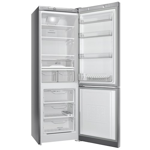 Холодильник комби INDESIT DF 4181 X Надежный, экономичный и вместительный комби холодильник, который отличается функциональной морозильной камерой. INDESIT DF 4181 X имеет стильный дизайн цвета нержавеющей стали с внутренней ручкой. Система No Frost позволяет исключить образование инея на стенка и тем самым уменьшить энергопотребление и необходимость разморозки. Холодильная камера имеет три стеклянные полки с белым профилем, ящик для хранения овощей, подвижную зону свежести Flexi Use Box и 4 полки на дверце. Морозильная камера вмещает три ящика, которые позволяют хранить большое количество продуктов. В случае отключения электричества холодильник способен до 13 часов сохранять холод. Двери оснащены автоматической системой закрывания, а также при необходимости могут быть перевешены на другую сторону Холодильник комби, нижнее распололожение морозильника Размораживание - Full NoFrost Общий объем 333 л. Объем холодильной камеры 213 л Объем морозильной камеры 88 л Класс энергопотребления А+ Хладагент R600a