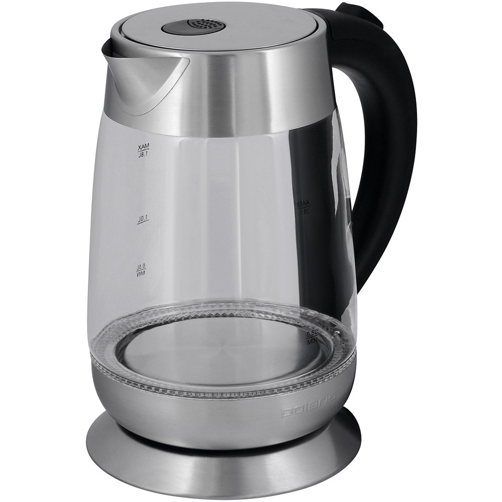 Электрочайник Polaris PWK1833CGL объем 1.8 л мощность 2200 Вт индикация включения закрытая спираль установка на подставку в любом положении корпус из стали и стекла подсветка корпуса вес 1.17 кг