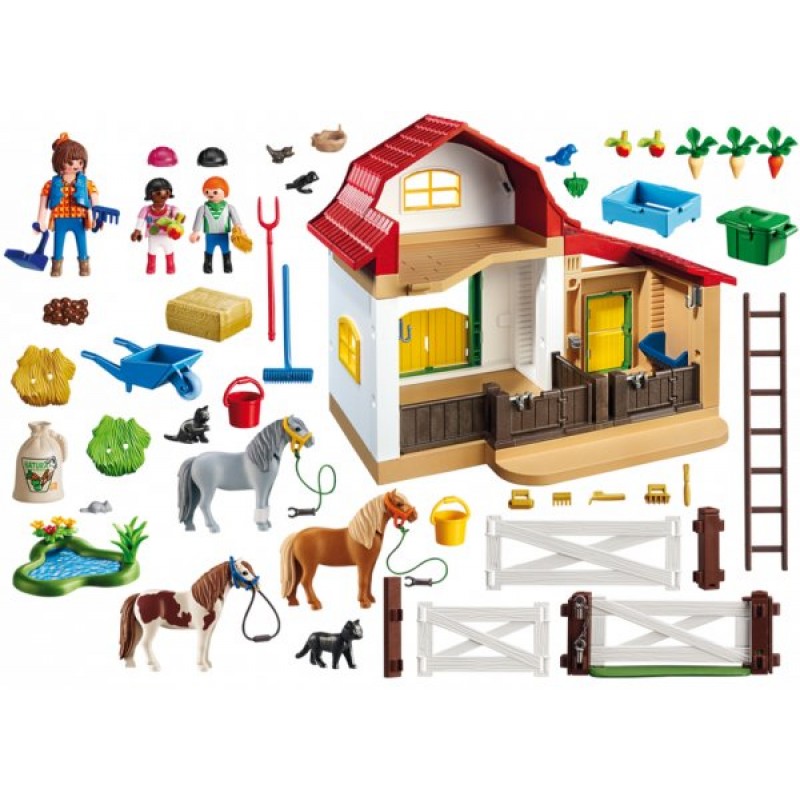 Playmobil Pony Farm PM6927 На ферме Plaimobil два этажа. На первом этаже зона для лошадей. На втором можно устроить зону для хранения припасов. Так же в наборе есть элменты для загона, который можно установить отдельно от здания или пристроить к нему. В комплекте фигурки трёх человечков, трёх лошадей, двух кошек, корм для животных, щётки, лестница и множество дополнительных аксессуаров. Для детей в возрасте от 4 лет.