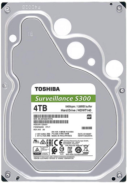 3.5" HDD 4TB Toshiba Surveillance S300 HDWT140UZSVA, 5400 rpm, SATA3 6GB/s, 128MB (hard disk intern HDD/внутренний жесткий диск HDD) 3.5-дюймовый жесткий диск для систем видеонаблюдения Toshiba S300 разрабатывался и испытывался для круглосуточной надежной эксплуатации в системах видеонаблюдения. При его производстве основной упор делается на скорость, высокую емкость и увеличение времени хранения данных. S300 поддерживает до 64 камер высокого разрешения, с которых вы сможете записывать и анализировать каждый кадр. Объем свободного пространства имеет принципиальное значение, когда нужно непрерывно снимать все происходящее на протяжении длительного времени. Емкость до 10 ТБ позволяет регистрировать и воспроизводить события в режиме реального времени с высоким разрешением, поддерживая идентификацию объектов и распознавание лиц. Запись каждого кадра, анализ мельчайших подробностей При анализе видео, снятого системами видеонаблюдения, нельзя рисковать ни одним кадром. Именно поэтому ваша система хранения данных должна обеспечивать безупречное быстродействие для обнаружения быстрого движения, регистрации мельчайших подробностей и выполнения распознавания лиц. Жесткий диск S300 специально разрабатывался с учетом ваших жестких требований. Он производится с прицелом на круглосуточную надежность и высокое быстродействие, чтобы вы никогда ничего не упустили. Разработан и проверен на совместимость Жесткий диск S300 специально проектировался и проверялся на поддержку до 64 камер высокого разрешения, что обеспечивает фантастическую гибкость и масштабируемость ваших систем видеонаблюдения. Совместимость с цифровыми видеорегистраторами (DVR), сетевыми видеорегистраторами (NVR), видеосерверами и системами управления видео для круглосуточного обеспечения безопасности. Ваша система видеонаблюдения никогда не спит, чтобы вы могли спать спокойно. Лучшее в отрасли быстродействие Буфер объемом 128 МБ и высокая скорость передачи данных отвечают требованиям, которые предъявляются к обработке данных видеонаблюдения, формируемым потоками данных с камер более высокого разрешения. Более высокое быстродействие в режиме реального времени достигается благодаря технологии Toshiba Dynamic Cache Technology, которая оптимизирует выделение кэша для циклов чтения и записи с применением встроенного алгоритма кэширования и управления буфером. Встроенные датчики угловых колебаний Обычные жесткие диски, не оснащенные датчиками угловых колебаний, могут отрицательно повлиять на быстродействие системы с несколькими отсеками, приводя к распространению вибрации. S300 обеспечивает высокую надежность, сводя к минимуму вибрацию за счет расширенных методов контроля и технологии датчиков. Несколько датчиков обнаруживают малейшие сотрясения, а встроенные датчики угловых колебаний также компенсируют такие колебания, устраняя вероятность распространения вибрации в системах с несколькими отсеками. Высокая надежность Компоненты диска S300, отличающиеся высокими прочностью и быстродействием, справляются с самыми сложными условиями для обеспечения более высокой надежности. Если диск эксплуатируется при высокой температуре, запускается оптимизированная скорость подвода головки, которая позволяет снизить потребление электроэнергии, в то же время автоматически сокращая шум и вибрацию. Средняя наработка на отказ