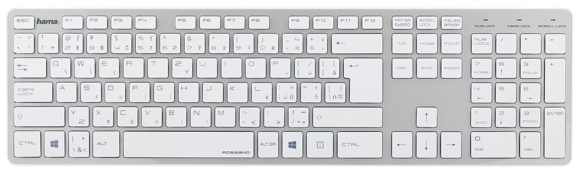 Клавиатура Hama Rossano R1050453 Тип клавиатуры мембранная Тип подключения проводной Интерфейс USB Количество клавиш 105 Цвет белый, серебристый Размеры (ШxВxГ) 441x10x124 мм Особенности и функции Длина провода: 1.8 м Производитель Hama