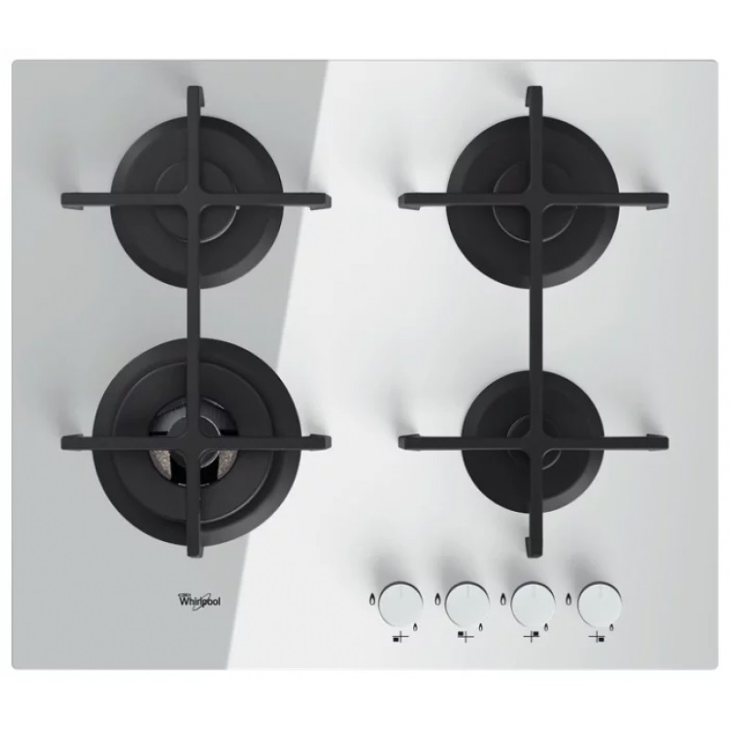 Варочная панель Whirlpool GOA 6423/WH White газовая варочная панель поверхность из закаленного стекла 4 газовые конфорки трехконтурная конфорка переключатели поворотные электроподжиг независимая установка габариты (ШхГ) 59x51 см