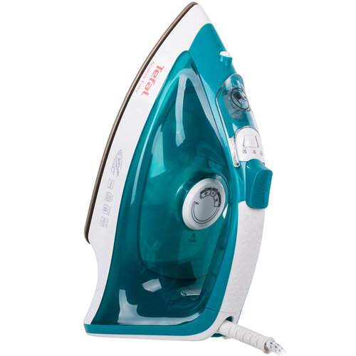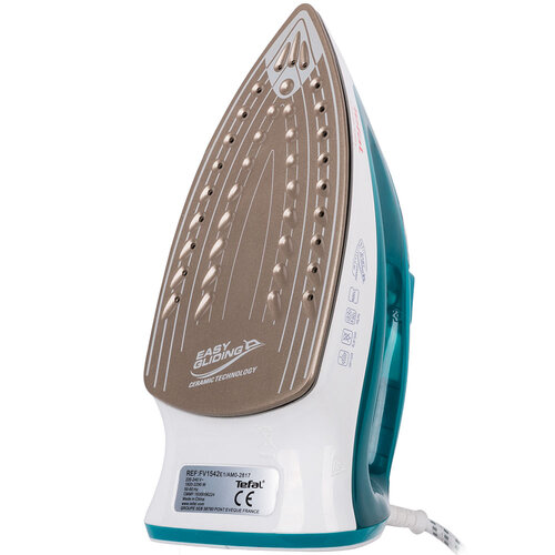 Утюг Tefal FV1542, blue мощность: 2000 Вт материал подошвы: керамика расход при постоянной подаче пара - 25 г/мин расход при паровом ударе: 100 г/мин регулировка подачи пара дополнительные функции: вертикальное отпаривание, защита от накипи, паровой удар, постоянная подача пара, противокапельная система длина сетевого шнура: 1.9 м