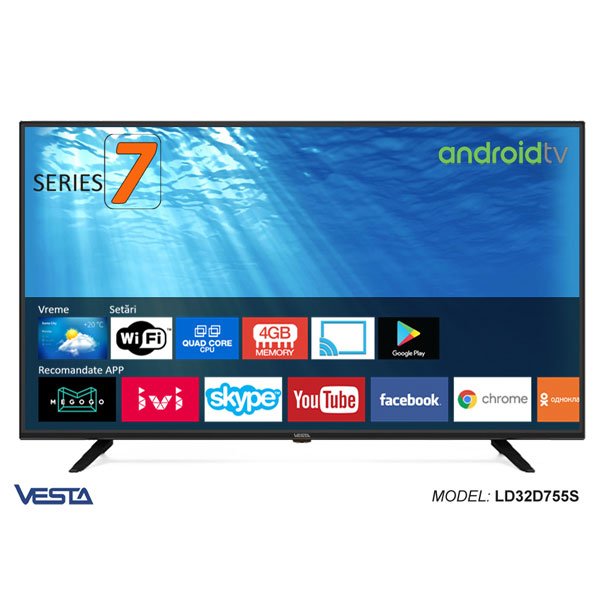 Телевизор Vesta LD32D755S Диагональ экрана 32 " Разрешение 1366x768 Изогнутый экран нет Тип матрицы LED Яркость 400 кд/м2 Динамическая контрастность 8 000 000:1 Угол обзора 176 ° Время отклика 2 мс Частота развертки панели 100 Гц Цифровое ТВ DVB-T/T2/C Smart TV есть Wi-Fi есть DisplayPort 1 Компонентный вход 1 Композитный вход 1 D-Sub (VGA) 1 HDMI 3 USB 2 Ethernet (LAN) 1 Мощность звука 2x12 Вт Потребляемая мощность 55 Вт Цвет чёрный Размеры настенного крепления VESA 100x100 мм Размеры без подставки 725x430x90 мм Размеры с подставкой 725x480x90 мм Особенности и функции таймер сна
