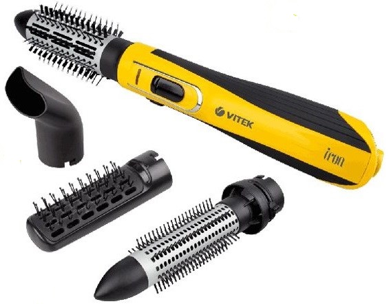 Фен-щетка Vitek VT-2509 Вращающийся шнур Защита от перегрева Индикация включения Керамическое покрытие насадок Возможность убрать зубчики/щетину Мощность 1200 Вт Кол-во режимов нагрева 2 Холодный воздух есть Ионизация есть Насадки 2 щетки, концентратор Длина сетевого шнура 1.8 м Петелька для подвешивания есть Цвет чёрный, жёлтый Производитель Vitek