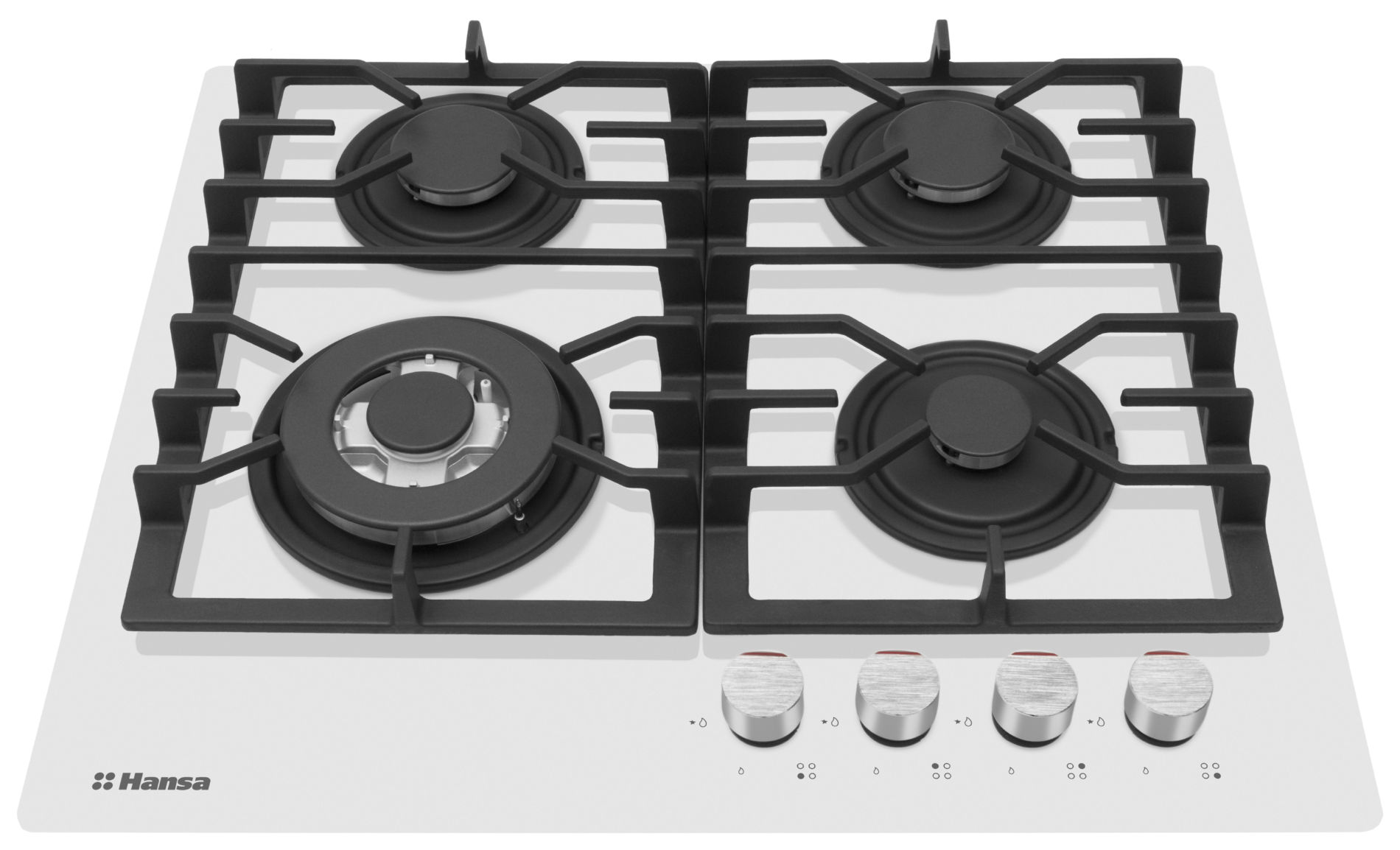 Варочная панель Hansa BHKW63138 газовая варочная панель поверхность из закаленного стекла 4 газовые конфорки трехконтурная конфорка переключатели поворотные электроподжиг независимая установка габариты (ШхГ) 60x52 см Цвет белый