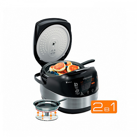 Multicooker Redmond RMK-M911E 1000W, 5l ceramic container with non-stick surface, 45 programmes (17 automatic, 28 for custom settings), 3D-heating, LCD colour display, cooking book, black Компактная мультикухня RMK-M911-E – это инновационный прибор с широчайшими функциональными возможностями, ведь мультикухня, по сути, представляет собой уникальную программируемую плиту! Мультикухня заменяет плиту и мультиварку Готовить в мультикухне REDMOND Masterfry® можно как в чаше, так и на сковороде или в любой другой подходящей термостойкой посуде*. Хотите пожарить яичницу на завтрак или бифштексы на ужин? Поднимите ТЭН мультикухни и готовьте на входящей в комплект сковороде! ТЭН мультикухни со сковородой, в отличие от мультиварки, абсолютно плоский: для приготовления вам потребуется минимум масла, ведь оно не будет стекать к краям посуды. Продукты прогреются равномерно по всему объему – стейки отлично прожарятся и по краям, и в середине, а рагу не пригорит к кастрюле. В RMK-M911-E предусмотрены 17 автоматических программ, готовить на которых можно как при поднятом, так и при опущенном ТЭНе. Также при обоих положениях ТЭНа можно использовать МУЛЬТИПОВАР – программу, позволяющую самостоятельно установить температуру и время приготовления, и готовить в автоматическом режиме по своим личным настройкам. С помощью мультикухни RMK-M911-E можно готовить ужин для одного человека в небольшой кастрюле или суп на всю семью в комплектной чаше. При этом работа мультикухни полностью автоматизирована: если автоподогрев отключен, RMK-M911-E прекращает работу по окончании установленной программы – еда не подгорит, а прибор не будет расходовать энергию впустую. + СКОВОРОДА И ОБШИРНАЯ КУЛИНАРНАЯ КНИГА В КОМПЛЕКТЕ! *Диаметр дна сковороды и другой используемой посуды не должен превышать диаметр нагревательного диска прибора. Следите, чтобы края и ручки посуды не соприкасались с пластиковыми частями корпуса мультикухни и уплотнительным кольцом крышки. Объем чаши: 5 л Мощность: 860-1000 Вт Напряжение: 220-240 Дисплей: светодиодный цветной Съемный паровой клапан: да Съемная внутренняя крышка: да Количество программ: 17 программ (17 автоматических) Функция поддержания температуры готовых блюд (автоподогрев) есть, до 24 часов Функция отключения автоподогрева есть Функция разогрева блюд есть Выбор температуры приготовления есть Функция отложенного старта есть, до 24 часов Masterfry® есть