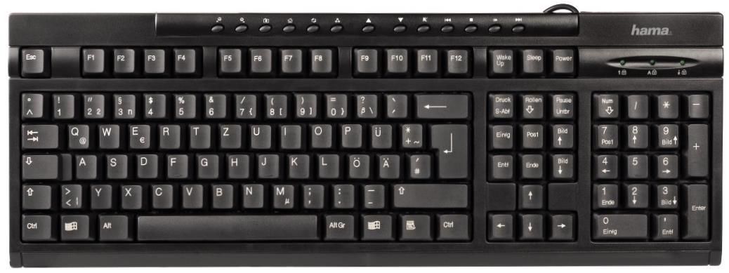 Клавиатура Hama AK-220, RUS, R1011288 Тип клавиатуры мембранная Тип подключения проводной Интерфейс USB Количество клавиш 108 Подсветка клавиш нет Цвет черный Размеры (ШxВxГ) 455x25x165 мм Особенности и функции Длина провода: 1.8 м Производитель Hama