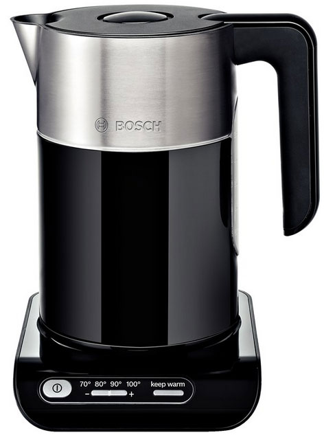 Электрочайник Bosch TWK8613P, inox black объем 1.5 л мощность 2400 Вт индикация включения, поддержание тепла закрытая спираль установка на подставку в любом положении корпус из стали и пластика ненагревающийся корпус выбор температуры нагрева воды вес 1.9 кг