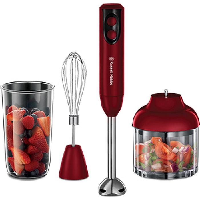 Блендер Russell Hobbs 18986-56/RH Мощность 400 Вт при максиммальной загрузке (300 Вт рабочая мощность) 2 скорости Съемная погружная часть и ножи из нержавеющей стали В комплекте мерный стакан емкостью 0.5 л В комплекте большой измельчитель емкостью 0.5 л. с ножами из нержавеющей стали В комплекте металлический венчик Насадки безопасны для мытья в посудомоечной машине Стильная отделка красным цветом с черными акцентами.