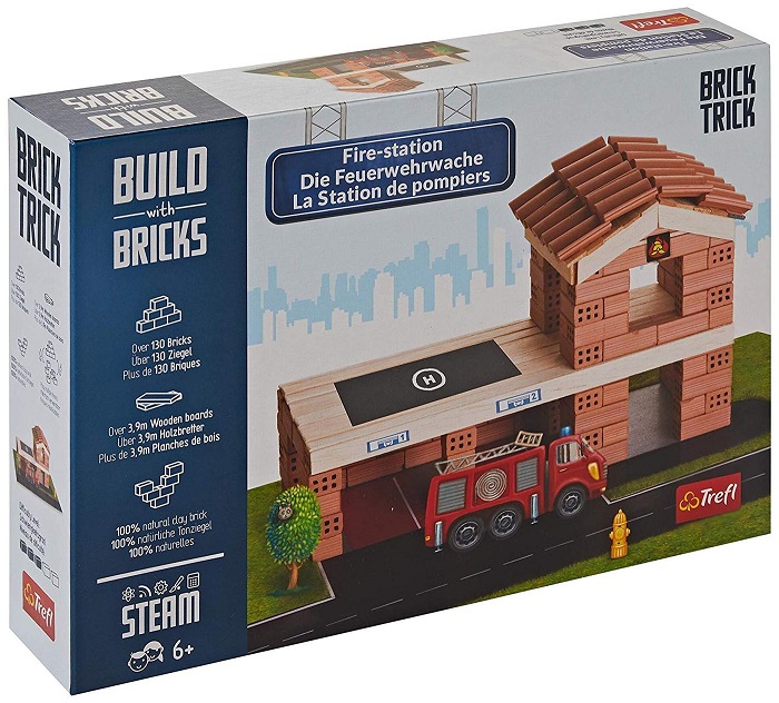 Trefl Brick Trick - Fire station_L_HU_RO Станьте подрядчиком с настоящими глиняными кирпичами и деревом для собственных конструкций. Откройте для себя мир веселья и творчества, построив свой собственный от фундамента до готового здания. Благодаря кладке, подготовке и обработке материалов, создайте и украсьте свое собственное прекрасное сооружение.