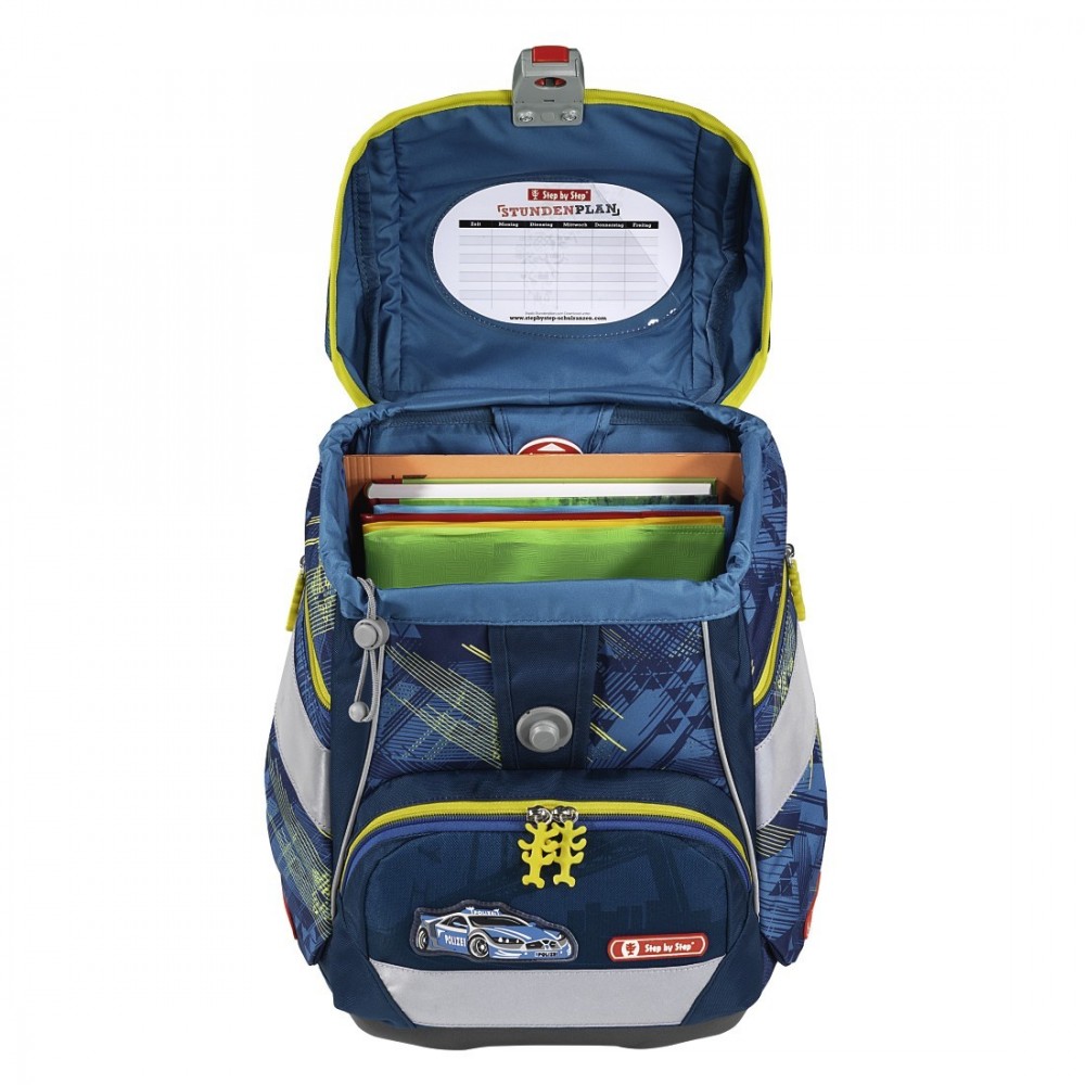 "City Police" LIGHT 2 Schoolbag Set, 4 pieces Сумка со съемным усилением по бокам и спереди: превращает сумочку в школьную сумку - Усиление также можно использовать как шаблон для рисования (например, цифры, буквы , геометрические формы) - плечевые ремни анатомической формы - бесступенчатая регулировка высоты плечевой опоры с помощью вращающегося механизма внутри обода - регулировка положения ремней - регулируемый по высоте нагрудный ремень - съемный плавник для идеального комфорта при ношении - предварительно сформированный и мягкий задняя подкладка для оптимальной циркуляции воздуха - светоотражающий материал ORALITE для безопасности дорожного движения - магнитная застежка Fidlock позволяет легко открывать и закрывать школьную сумку