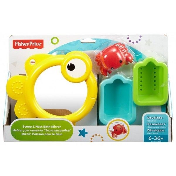 FP Jucarie pentru baie "Pestesor" Fisher-Price Игрушка для купания "Рыбка" С набором "Рыбка" малыши с нетерпением будут ждать возможности поплескаться в воде. В набор входят две красочные чашечки для зачерпывания воды, краб-брызгалка, а также рыбка-зеркало. Зеркало имеет присоску, которая надежно крепится к стене. А также на зеркальце есть специальный выступ, на который можно повесить чашечки после купания, для того, чтобы они просохли. Рекомендуемый возраст: от 6 до 36 месяцев