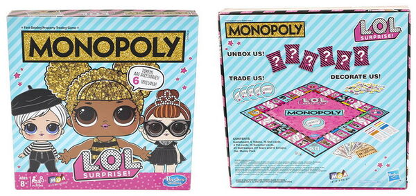 MONOPOLY LOL SURPRISE Настольная игра "Monopoly LOL Surprise" Игроки на этот раз покупают, продают и обменивают куклы других игроков, показанных на игровом поле, с целью сбора редких. Карты заменяют карты Chance, Stars и Emojis, дома и отели, а фишки - L.O.L Сюрприз! Игрокам предлагается удивительный и захватывающий опыт, когда чипы будут выпущены. Эта игра L.O.L Surprise - отличная идея как для поклонников LOL, так и для монополистов. Собери самые редкие куклы, чтобы выиграть игру! Количество игроков: 2 - 4 Рекомендуемый возраст: 8 лет +