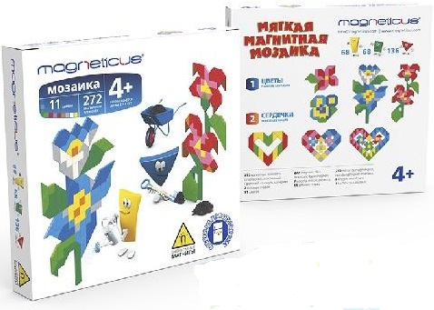 Magneticus Set creatie "Midi mozayka flori" Magneticus Mагнитная Мозаика "Цветы" Дети очень любят складывать из разноцветных деталей мозаики яркие картинки. Но в этот раз в их распоряжении появятся не просто красочные полимерные элементы, а еще и магнитные, что позволяет им надежно прикрепляться к любой металлической поверхности и даже к кухонному холодильнику. В наборе представлены мягкие элементы мозаики разной формы и ярких цветов, из которых дети смогут собрать красочную картинку. Сборка красочных картинок из разноцветных деталей станет не только интересным видом досуга, но и тренировкой для мелкой моторики рук. В комплекте: 272 элемента, листовка с образцами. Рекомендуемый возраст: 4 года +