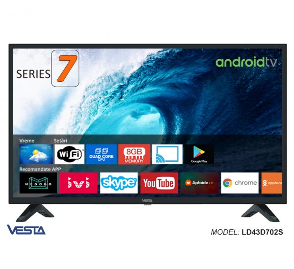 Телевизор Vesta LD43D702S Тип LED-телевизор Система AndroidTV 7.1.1 Google Play Market Диагональ: 43" (110 cm) Разрешение FULL HD 1920x1080 Цифровой тюнер DVB-T/T2/C Видеообзор настройки бесплатных цифровых каналов USB -Video/Photo/Music (Поддерживает все популярные форматы)