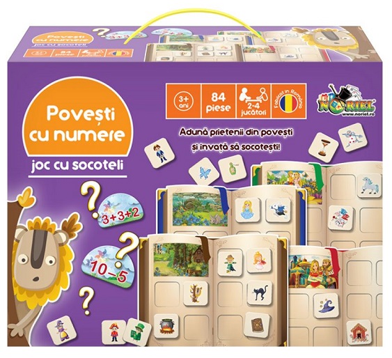 NORIEL Noriel Games-Povesti cu numere Настольная игра "Сказки с номерами" Изучайте новые варианты счета, развивайте свой интеллект и изобретайте ходы в игре, которая вас удвит! - Игрок, который в свою очередь берет первую фишку в стопке, возвращает ее на другую сторону и внимательно смотрит на число, напечатанное на ней - поиск среди карт с подсчетом для расчета, результат которого равен числу на фишке - после того, как он выполнил расчет и подумал, что правильно определил карточку, он возвращает ее другой стороне, где напечатан правильный результат - если он совпадает с номером на фишке, игрок оставляет фишку, помещая ее лицом, показанным на одной из коробок на игровом поле - если ответ игрока неправильный, он кладет фишку под колоду с лицом, показанным вверху, и картой с математическими операциями на месте. - Игра заканчивается, когда один из игроков заканчивает свою игровую карту 10 фишками. Набор содержит: - 4 игровых поля в виде сборника рассказов - 40 жетонов с предметами и персонажами - 40 карточек со счетами Рекомендуемый возраст: от 3 лет