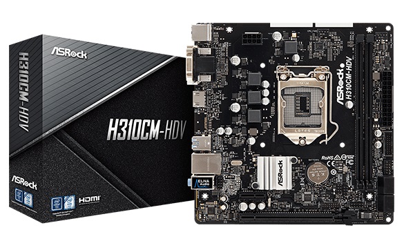 Материнская плата ASRock H310CM-HDV, Socket 1151, Intel H310 (9th/8th Gen CPU), Dual 2xDDR4-2666, CPU Intel graphics, VGA, DVI, HDMI, 1xPCIe 3.0 X16, 1xPCIe 2.0 x1, 4xSATA3, ALC887 HDA, GbE LAN, 4xUSB2.0, 4xUSB 3.1, mATX материнская плата форм-фактора microATX сокет LGA1151 v2 чипсет Intel H310 2 слота DDR4 DIMM, 2133-2666 МГц разъемы SATA: 6 Гбит/с - 4