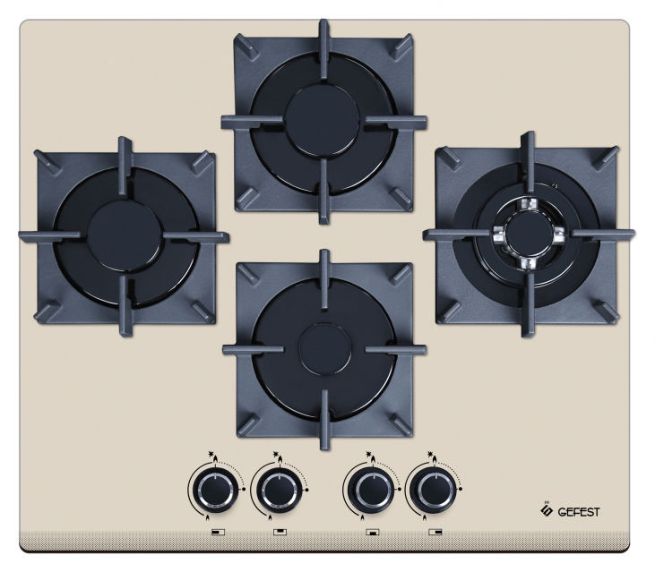 Газовая варочная панель Gefest ПВГ 2231-01 K38 поверхность из закаленного стекла 4 конфорки независимая установка электроподжиг газ-контроль чугунные решетки поворотные переключатели ШхГ: 62х52.50 см.