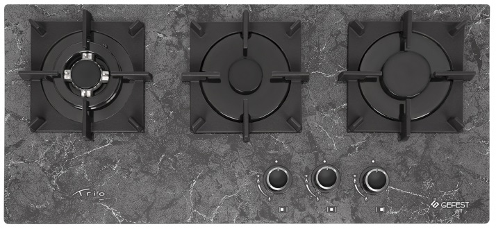 Газовая варочная панель Gefest ПВГ 2150-01 K93 поверхность из закаленного стекла 3 конфорки независимая установка электроподжиг газ-контроль чугунные решетки поворотные переключатели ШхГ: 75х35 см