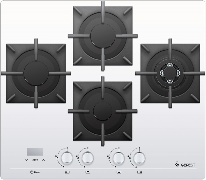 Газовая варочная панель Gefest ПВГ 2231-03 K32 поверхность из закаленного стекла 4 конфорки независимая установка электроподжиг газ-контроль чугунные решетки поворотные переключатели ШхГ: 60х52.50 см
