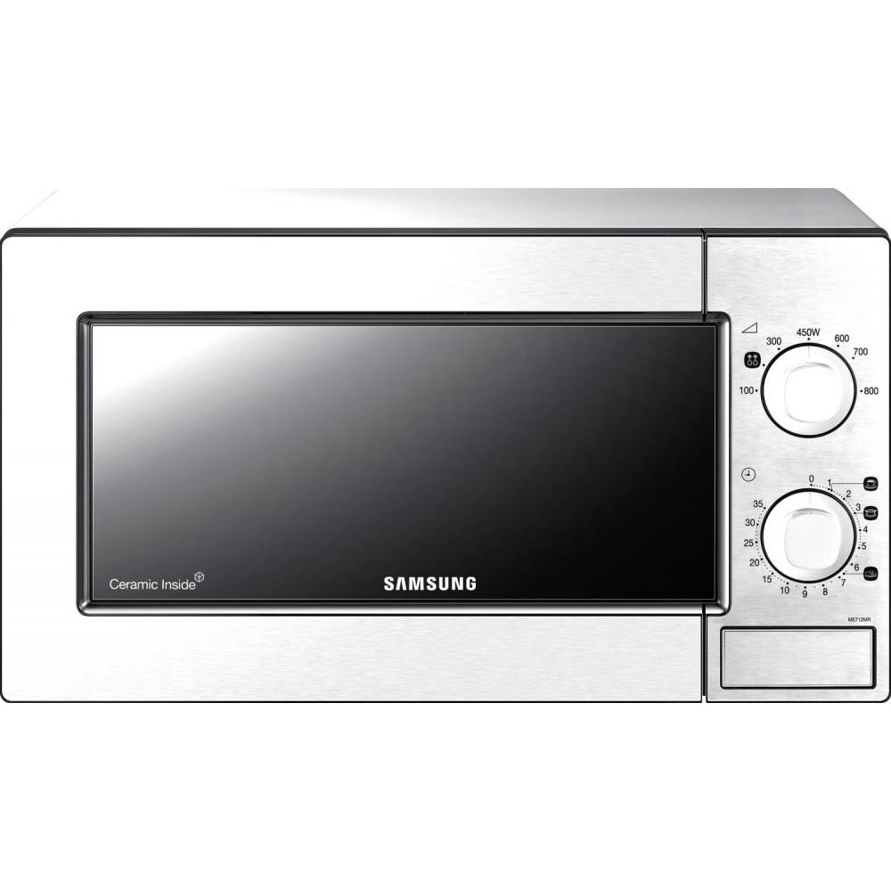 Микроволновая печь Samsung ME81MRTS/BW, silver Микроволновка Samsung ME81MRTS/BW представляет собой отдельностоящий прибор стильного дизайна полезным объёмом 23 литра с кнопочным открыванием дверцы. В модели максимальной мощностью 1150 Вт установлен поворотный стол диаметром 288 мм, а внутренняя поверхность рабочей камеры покрыта биокерамической эмалью. Это - стойкий к царапинам и легкомоющийся материал, благодаря которому покрытие остаётся гладким и хорошо очищается от пищевых загрязнений. Устройство оборудовано источником СВЧ-излучения мощностью 800 Вт с 7-уровневой регулировкой. Благодаря инновационной технологии TDS обеспечивается равномерное распределение энергии микроволн в печи. Устройство обладает функцией быстрого размораживания, которая не обезвоживает пищу, сохраняя её свежесть. Микроволновка Samsung ME81MRTS/BW с механическим управлением двумя удобными поворотными переключателями оснащена встроенным таймером на 35 минут, с помощью которого можно точно задавать время работы прибора. Производитель: Samsung Тип: Микроволновка Способ установки: отдельностоящая Объем, л: 23 Диаметр поворотного стола, мм: 288 Тип управления: механический Таймер: механический, 35 мин Максимальная потребляемая мощность, Вт: 1150 Ширина, см: 48,9 Высота, см: 27,5 Глубина, см: 35,9 Мощность СВЧ-излучения, Вт: 800 Наличие гриля: нет Конвекция: нет