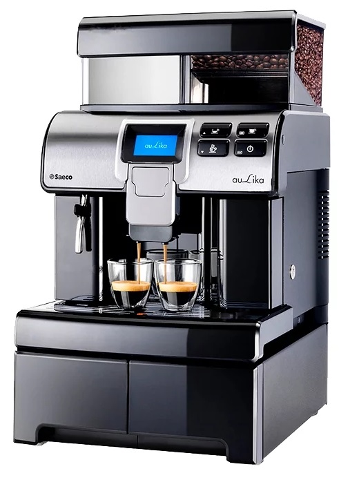 Saeco Aulika Office + Base автоматическая, 15 бар для зернового кофе кофемолка с регулировкой степени помола контроль крепости кофе настройка температуры регулировка порции воды самоочистка от накипи одновременная раздача на 2 чашки дисплей корпус из пластика