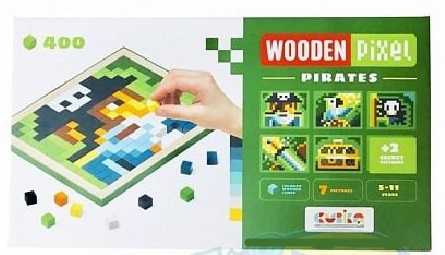 Cubika jucarii dezvoltare "Wooden Pixels5" Cubika Деревянная мозаика "Пираты" Предложите мальчишкам собрать из разноцветных деталей этой мозаики яркие картинки, изображающие пиратов и сопутствующие им аксессуары. В наборе представлены карточки с образцами, поэтому крохи легко справятся с заданием и потренируют при этом мелкую моторику рук. С помощью маленьких деревянных кубиков-пикселей можно собрать 7 картинок на пиратскую тему: Пират; Попугай пирата; Пиратский флаг; Пиратский меч; Сундук с сокровищами;а также, 2 секретные картинки. В наборе: 400 разноцветных деревянных пикселей; Деревянная рамка;7 схем-картинок (5 цветных, 2 черно-белых); Таблица соответствия цветов. Комплект: 400 деталей, 7 картинок (5 + 2 скрытые) Рекомендуемый возраст: от 5 до 11 лет