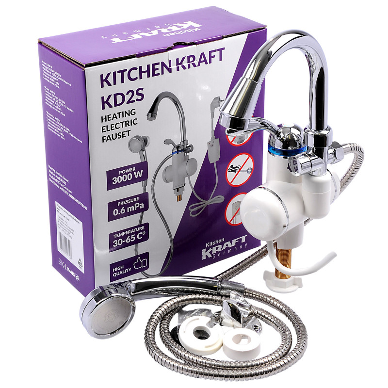 Электрический кран 3Kw Kitchen Kraft KD2S Производитель Kitchen Kraft Мощность (W) 3000 Напряжение (V/Hz) 230 Материал корпуса Metal-plastic Макс. допустимая температура воды (°С) 30 - 65 °С Цвет Alb Тип Curgator Тип питания de la retea
