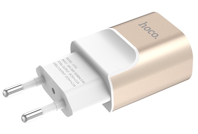 "Hoco travel adapter, Metal 2xUSB, 2.1A, C47A Input : 100-240V ~50/60Hz Max0.6A Output: 5.0V-2.0A Standard USB interface - Plug and use Gold"