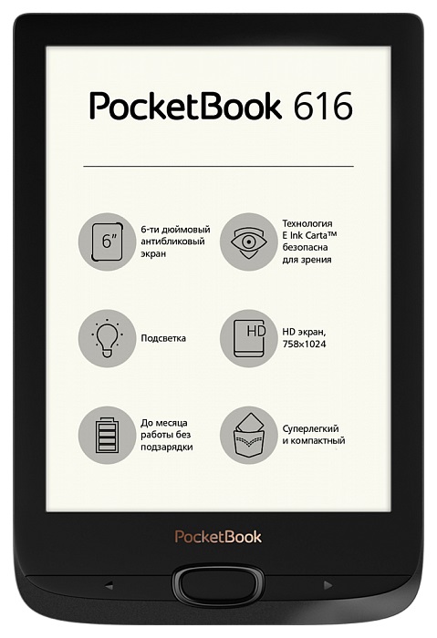 PocketBook 616 6" E Ink®Carta™ Black электронная книга с ч/б экраном 6" E-Ink Carta, с подсветкой разрешение 1024x758 16 оттенков серого карты памяти microSDPocketBook 616 6" E Ink®Carta™ Black