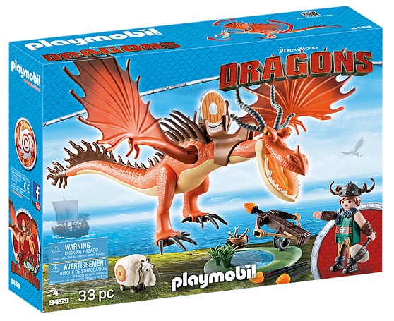 Playmobil Snotlout and Hookfang PM9459 1 сопляк Животные: 1 драконий крючок, 3 сельди, 1 овца. Аксессуары: 1 баллиста, 3 огненные стрелы, 1 элемент ландшафта с прудом, 1 молот, 1 седло, 1 щит, 1 деревянное ведро.