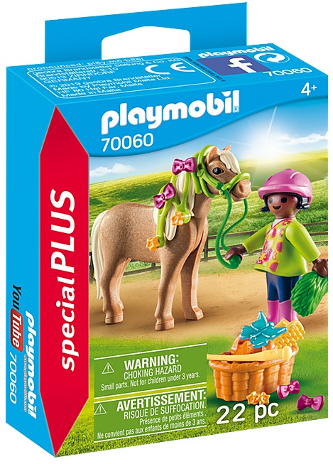 Playmobil Girl with Pony PM70060 Фигурки: 1 девушка Животные: 1 пони, 1 бабочка. Аксессуары: 1 шлем, 1 зеленый корм, 1 поводок, 1 поводок, 1 кнут, 1 набор украшений для лошадей, 1 корзина, 1 щетка для лошадей.