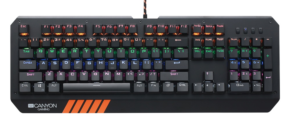 Gaming Keyboard Canyon Hazard, Mechanical, Blue SW, Anti-ghosting,Backlighting, Win Lock, Black, USB Благодаря инновационной механической системе кнопок, оптимальной глубине нажатия и быстрому отклику, эта клавиатура обеспечит вам победу в игре любого жанра. Каждая кнопка способна выдержать более 60 миллионов нажатий. В данной модели реализовано 20 типов яркой подсветки и специальные комбинации, настроенные для десяти самых популярных игр. 2 из 10 комбинаций можно перепрограммировать под индивидуальные особенности игрока. Продвинутая технология NKRO с защитой от фантомных кликов и залипания клавиш, а также блокировка «Windows/Start» обеспечат бесперебойный отклик даже при условии большого количества частых нажатий. Играйте и выигрывайте без компромиссов! 104 механические кнопки Синие механические переключатели Глубина нажатия 4.0 мм Глубина срабатывания 2.4 мм с силой 60+/-10g Кнопки рассчитаны на 60 миллионов нажатий NKRO-защита от залипания клавиш и фантомных кликов Блокировка кнопки "Windows/Start" 20 типов подсветки 6 настроек подсветки для наиболее популярных игр с возможностью перепрограммирования Нанесение символов методом "Double Injection"