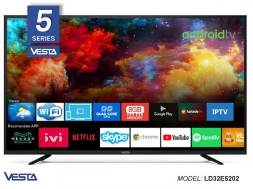 Телевизор Vesta LD32E5202 Тип LED-телевизор Система AndroidTV 9.0 Google Play Market Aptoide TV Market Диагональ 32" (82 см) Разрешение HD 1366x768 Цифровой тюнер DVB-T/T2/C