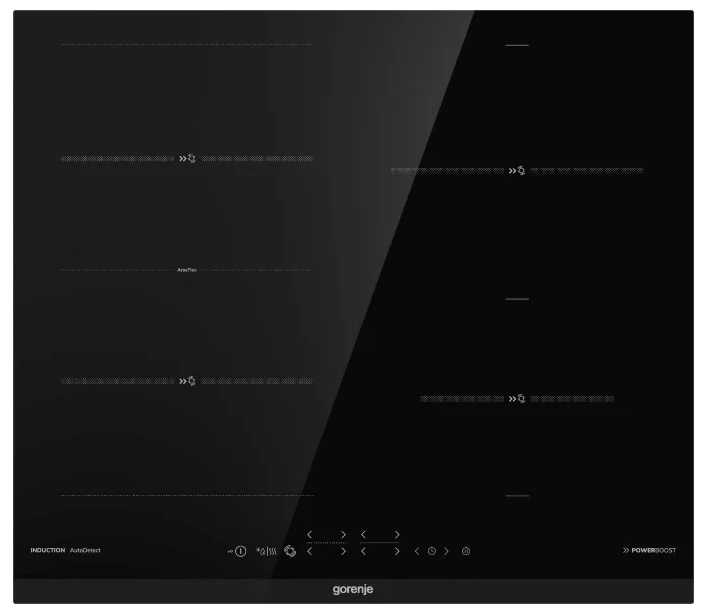 BinHob/ind Gorenje IT 645 BCSC Встраиваемая варочная поверхность Тип: Индукция Цвет: Черный Шлифованный передний край Сенсорное управление SmartControl Автораспознавание посуды: Автораспознавание места установки посуды Объединение конфорок AreaFlex
